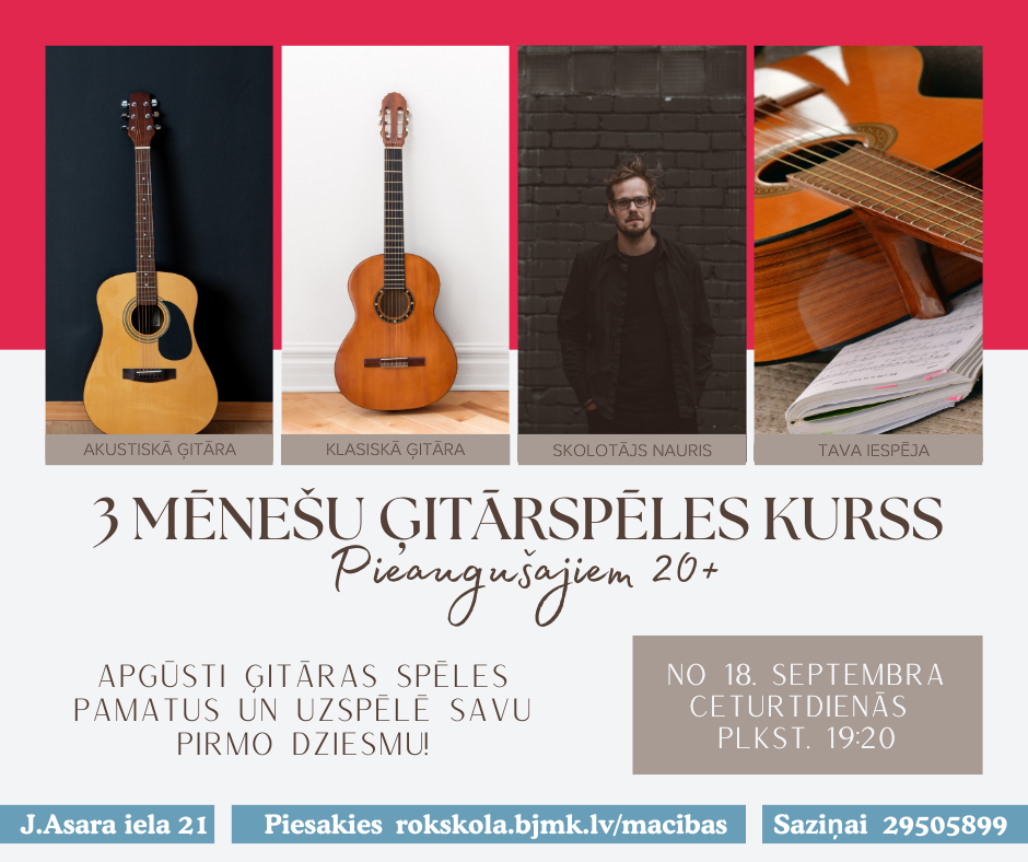 3 MĒNEŠU ĢITĀRAS KURSI PIEAUGUŠAJIEM Sākam ģitāras kursu pieaugušajiem 18.septembrī, ceturtdienu vakaros plkst. 19:20, piesakies!
