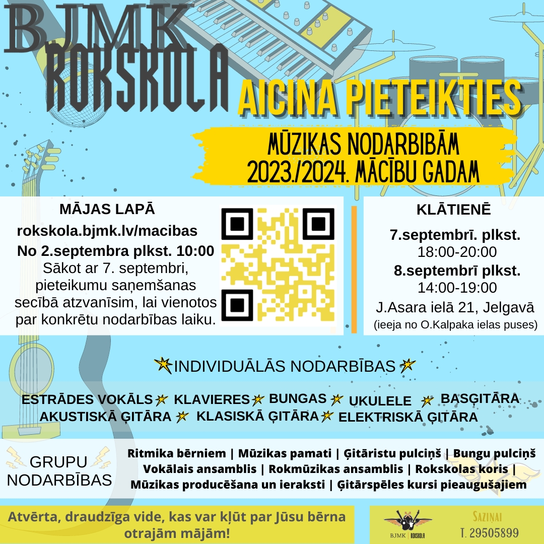 Pieteikšanās mūzikas nodarbībām BJMK Rokskolas interešu izglītības programmās 2023./2024. mācību gadam tiešsaistē: No 2.septembra plkst. 10:00. Sākot no 7. septembra, pieteikumu saņemšanas secībā atzvanīsim, lai vienotos par konkrētu nodarbības laiku.
